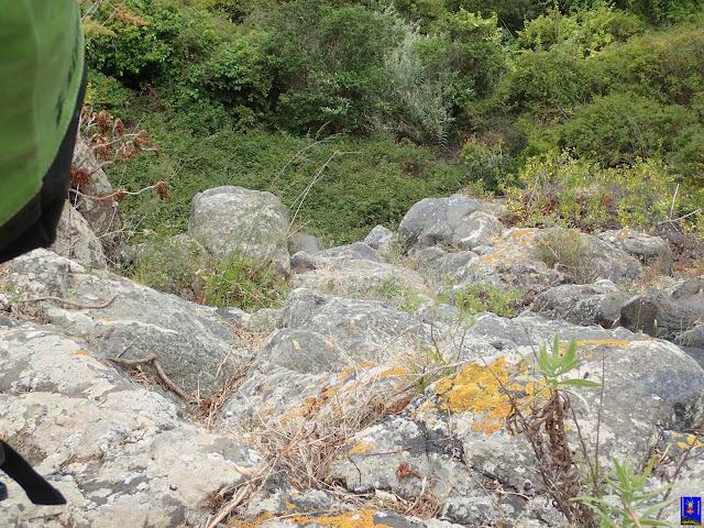 Pegados a la pared del salto se asciende unos metros, (sin llegar al borde del barranco, sólo unos 15 metros), y a continuación, la senda comienza a descender en zigzag, unos 12 m.