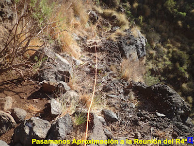 . No colocar bagas a la tubería. Si los anclajes del R6º están en mal estado, salvar el R6º por el sendero que viene de la Galería, por la izquierda del cauce. Siguiendo este sendero, se salva el salto del R6º.