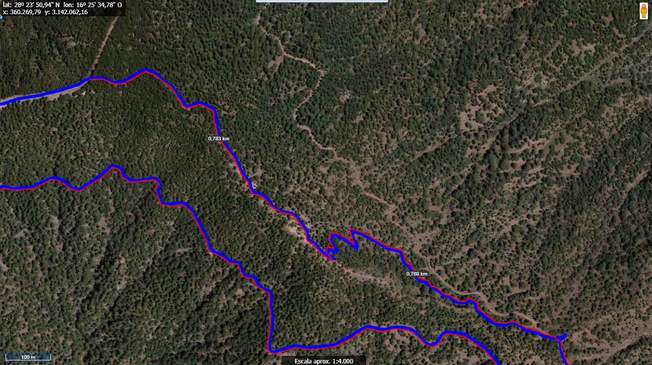 Se recorren 0,756 Km por la Pista de tierra hacia llegar al vehículo. "IDECanarias, GrafCan".