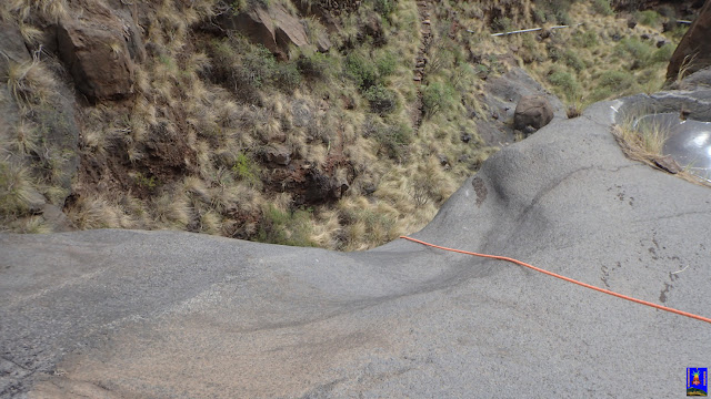 . No colocar bagas a la tubería. Si los anclajes del R6º están en mal estado, salvar el R6º por el sendero que viene de la Galería, por la izquierda del cauce. Siguiendo este sendero, se salva el salto del R6º.